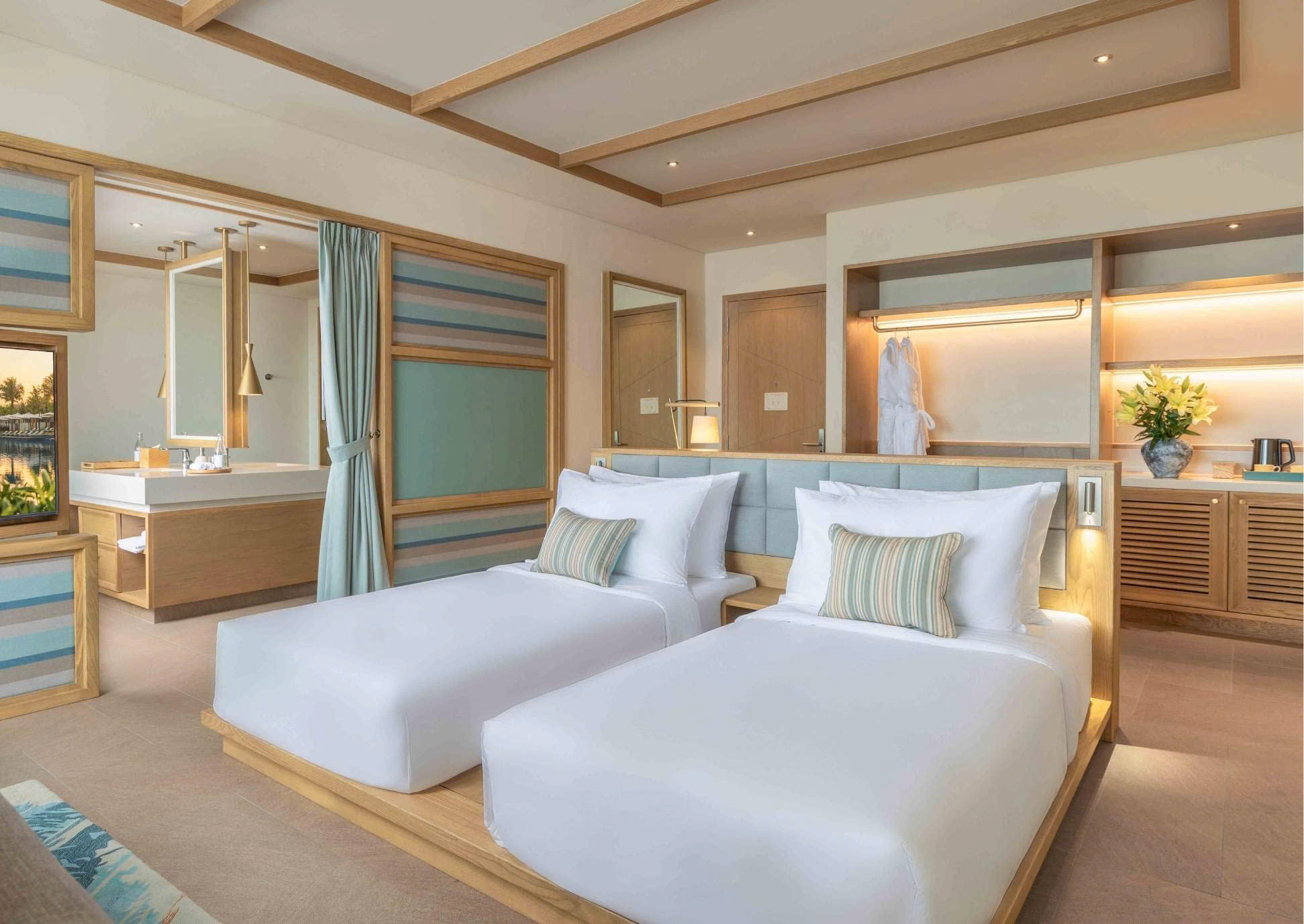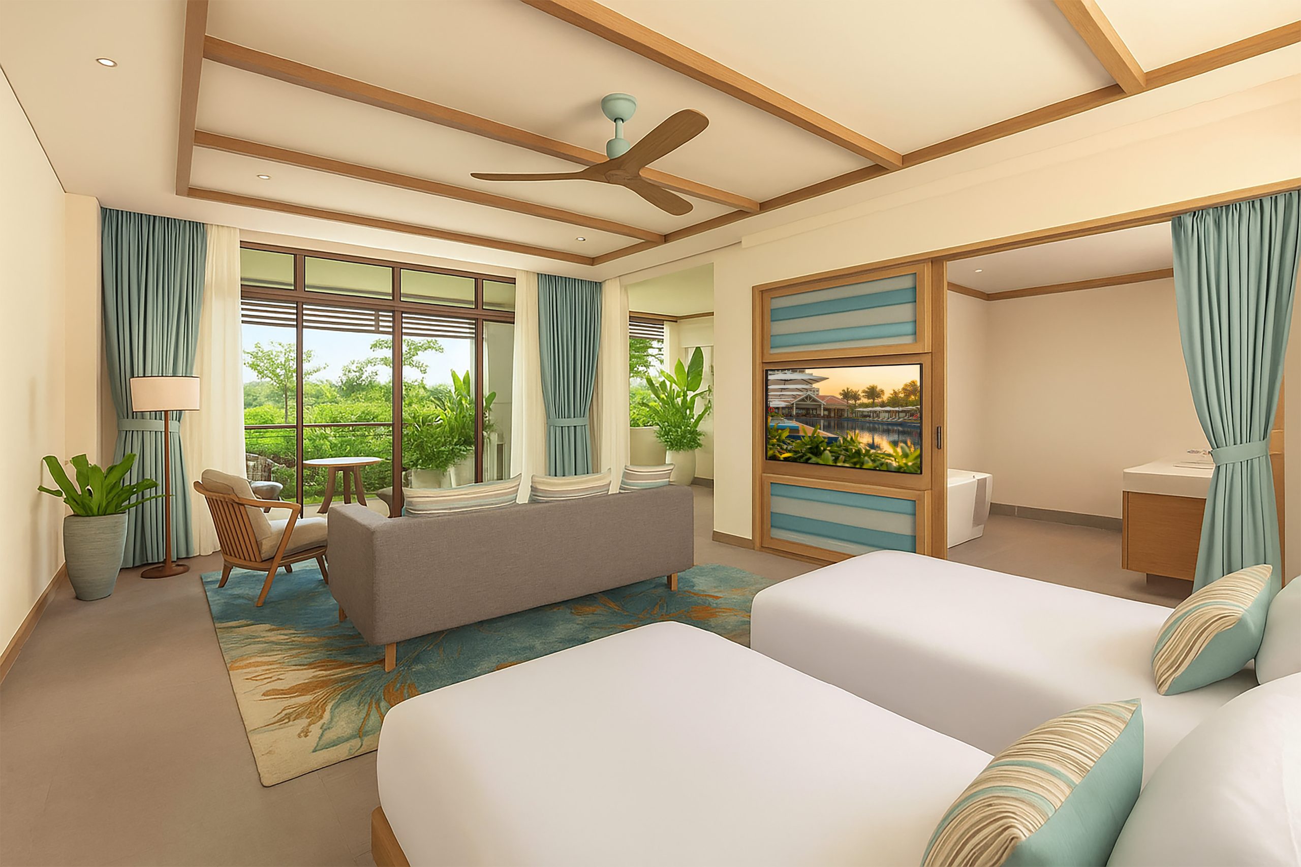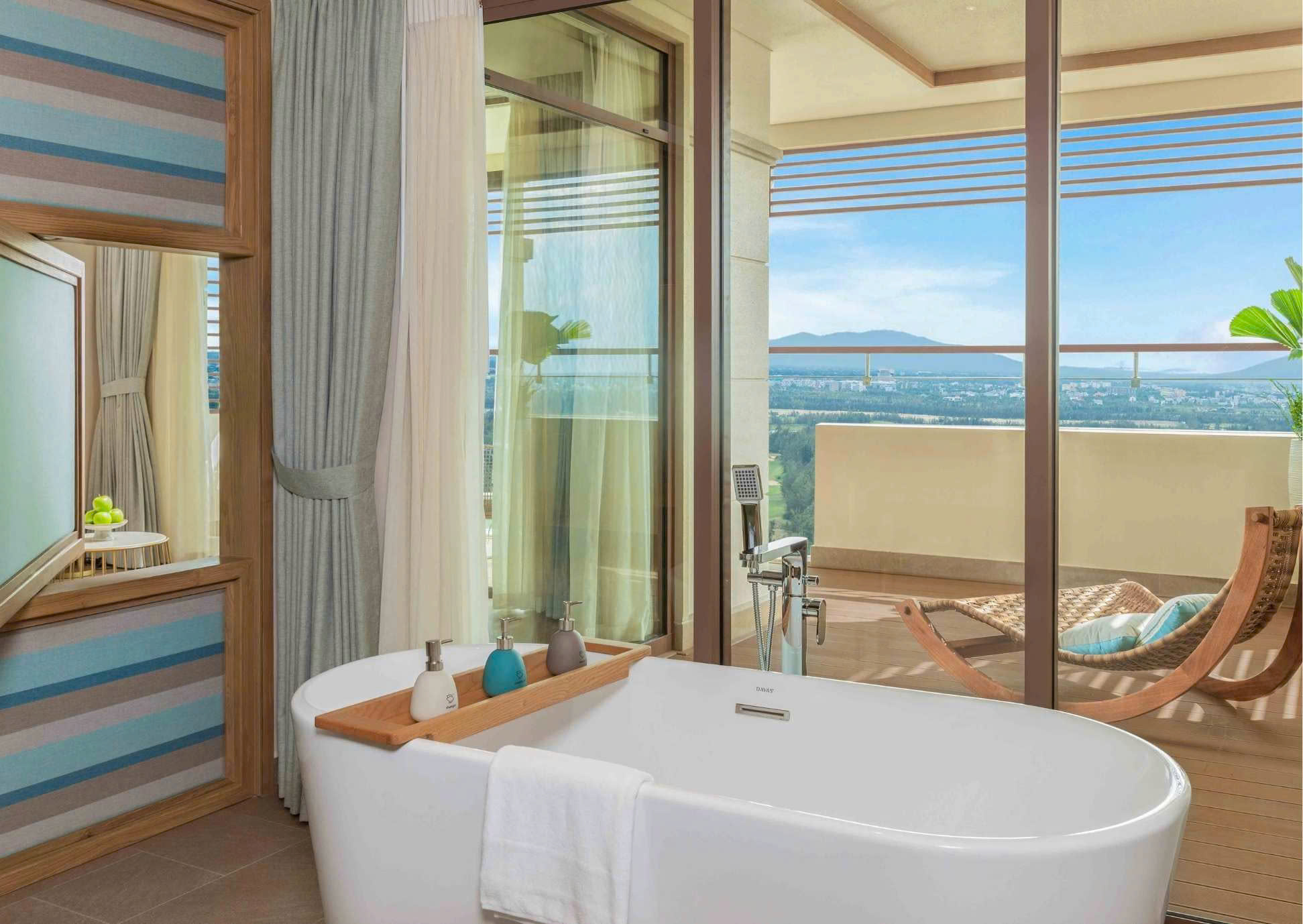 Immerse yourself in serene greenery with our spacious 60 sqm Garden View Suite. Designed for both elegance and comfort, this sanctuary features your choice of a stylish Twin or King bed, an indulgent en-suite bathroom, and a free-standing bathtub for the ultimate relaxation. Floor-to-ceiling windows invite natural light to flood the suite, seamlessly blending the beauty of the outdoors with refined indoor living. Guests can unwind in the indoor and outdoor lounging areas, savoring the tranquil garden views at any time of day. Whether you are returning from a day of exploration or simply seeking a peaceful retreat, the Garden View Suite offers a haven of calm and sophistication an ideal escape at Fusion Resort & Villas Da Nang – Wellness Inclusive, proudly ranked among the best resorts in Danang.