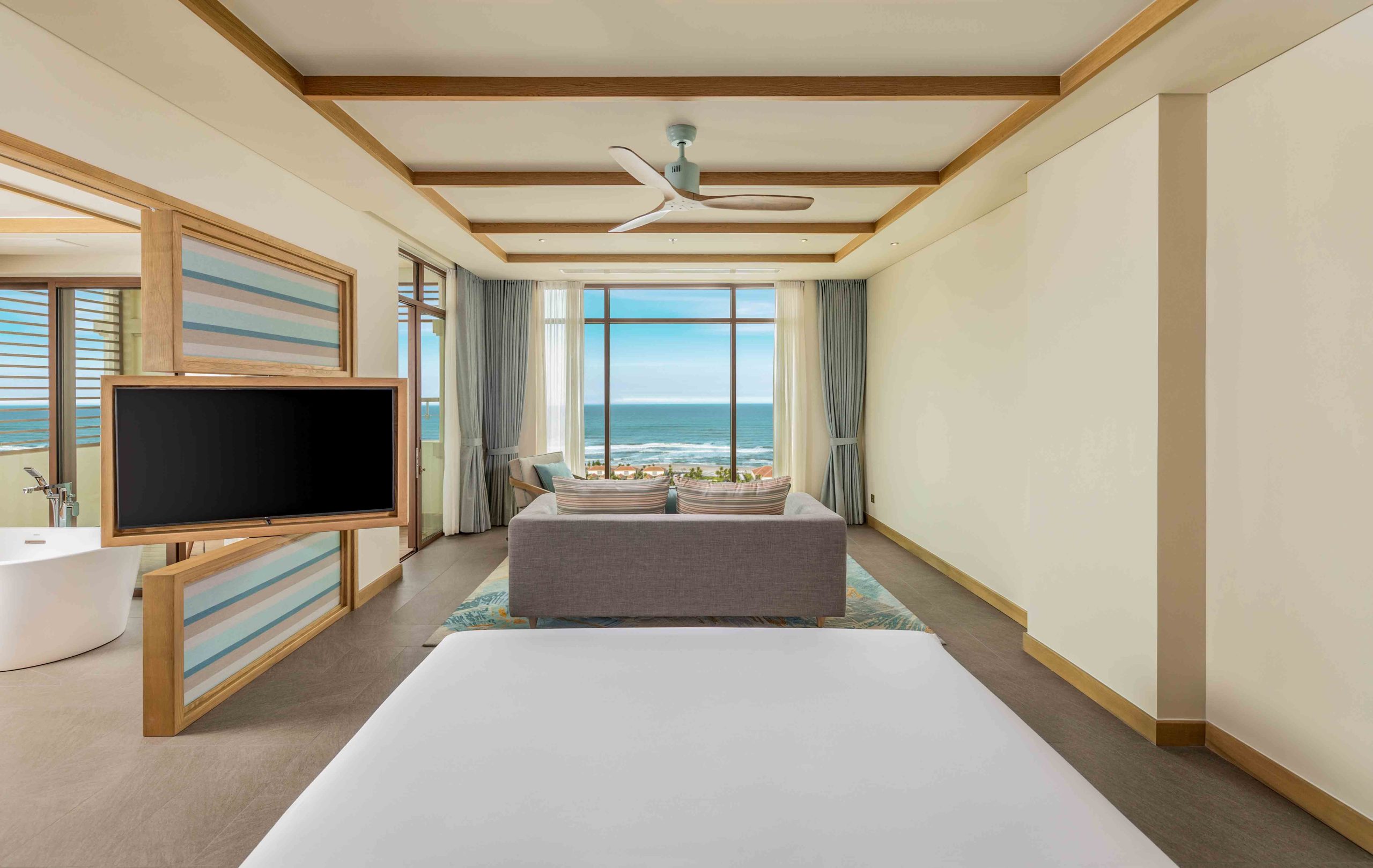 Wake up to sublime views over the royal blue ocean in the Ocean View Suite at our hotel, ranked among the best beach resorts in Vietnam. Spanning a generous 60 square meters, this suite room features breathtaking vistas through its floor-to-ceiling glass windows and expansive balcony. Luxuriate in either a twin or king bed, accompanied by an en-suite bathroom, comfortable sofas in the living area, and a freestanding bathtub. Whether you’re travelling with your special someone or with family, this room offers the perfect setting to unwind and create memorable moments together.